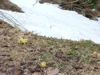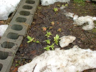 | 今日の ちょっとうれしい: 壁沿いの雪が解けた花壇には、クロッカスが芽を出しました。大きなエゾシカが 道を闊歩しているので、何とかシカの食害から守らなければ! また、凍って枯れていた鉢植えのローズマリーが、復活しました。ローズマリーはこの辺では 越冬が難しいので、益子に持って行って、庭に植えてこようと思っています。 |