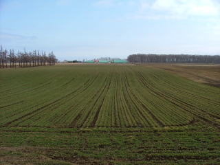 | 網走湖:湖岸の新緑がやさしい色合い。 | 北見:郊外の畑。 斜里地区より気温が高いので、 緑も濃さが違います。 |