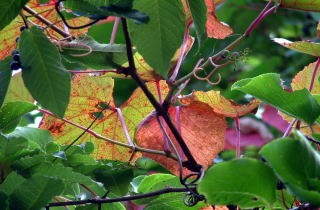 山の秋: 山はまだほとんど紅葉していませんが、 この山ブドウは、たまたま色付いていました。 実はそれほどたくさんは見えませんでした。 |