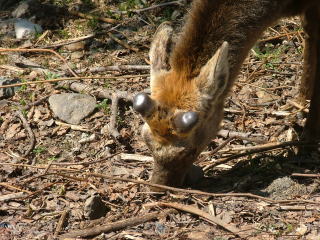 | 窯場の裏側の草原では、エゾシカがのんびりと草を食べています。 さて、ここでシカについて少しお勉強しましょう。 エゾシカはニホンジカの一種です。一番小さなヤクシカをはじめ、 日本には7種類のニホンジカが生息していて、その中で一番大きいのがエゾシカです。 右側の写真は角を落としたあとの、今のオスジカの角。 春から夏にかけての成長期の角で、袋角(ふくろづの)と呼びます。 ビロード状の毛に覆われていて、柔らかく、血液が通っています。 秋が近づくと内部が骨化し、血液の循環はなくなります。 やがて表皮がはがれて、骨化した角(枯れ角)が現われます。 冬を越して春になるとまた角を落として・・・の繰り返しです。 これは全ての種類のシカに共通の特徴です。 奈良公園のシカも、人間に切られはしますが、エゾシカと同じく、 春には落として、秋までにまた伸びてということを繰り返しているのですよ。 |