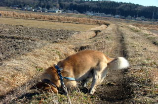 今日の穴掘り: いつもの散歩道の田んぼのあぜ道を歩いていると、 突然ナナが猛烈な勢いで穴を掘りだしました。 あっという間に頭が隠れるほどの大きさに掘ると、 頭を突っ込んで、やおら、クンクン! ナナが嗅ぎあてたのは、春の匂い? |