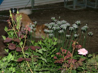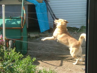解放されたナナ: せめて敷地内ではナナを自由にさせてやりた いと、常々思っていたのでしたが、そんな思い は圭一も同じだったようです。 門扉の隙間をネットでふさぎ、脱出しそうな 経路はすべて遮断して、時々ナナを放して やっています。追いかけっこしたり、ボールで 遊んだりと、ご機嫌のナナ。 |