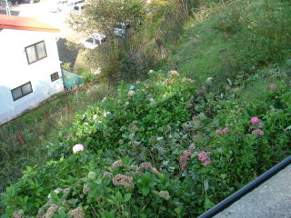 | 店横のネットに絡まって咲き出したクレマチス。 白と紫の二種類です。一番手前に見えて いるのはツキヌキニンドウ。本来、寒冷地では 冬越しができないとされているもので、毎年 やっと越冬して、なんとか咲いています。 |