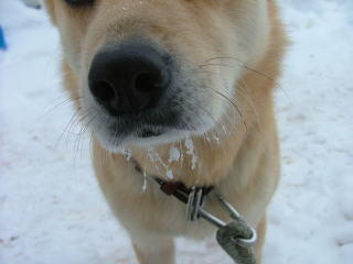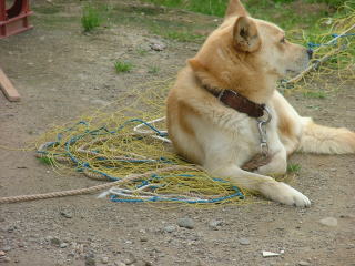 | 今日の悲劇! 「絵日記」に書いたように、私とナナの牧歌的な散歩の最中に、事件は起こりました。 崖側に張ってある白い紐に近づいていったナナが、突然 「ギャワ〜〜ン!」と悲鳴を上げて飛びすさったのです。 一瞬なにが起こったのかわかりませんでしたが、そうだ、ここにはクマよけの電柵があったのだと気が付きました。 私の不注意で、何も知らないナナは感電してしまったのです。 「ナナが死ぬ〜!」とあせる私は、座り込んでいるナナを抱きしめているよりほかありませんでした。 しかし、1分も経たないうちに、ナナは帰ろうといって私を引っ張ります。 え?歩けるの?心臓が止まったんでないの?と、?だらけのA子でしたが、とりあえず家に帰ってきました。 内臓が焼けただれているのではないかと気がかりで、ナナの主治医、「牛若船頭」に相談しようと思っていたら、 以心伝心で船頭登場。 ことの経緯を話すと、「だーいじょーぶだー。」と、例の調子で言います。 ナナが受けた電気ショックは、よくしなる木の枝のムチで叩かれたような感じなのだそうです。(船頭の体験談) 「心臓が弱い犬なら危ないが、普通の犬なら、なーんも心配ない。」とのことで一安心。 その後気をつけて観察していますが、ご飯もばくばく食べたし、A子不信もなさそうです。 あ〜、驚いた。 皆さん、ウトロでは白い紐に触ってはいけませんよ。心臓が弱い方やペースメーカーを入れている方は特に気をつけて下さい。 注意書きの看板は立ててあるはずですが、景色に気をとられていると、見落としかねませんからね。 (町の中の、人が歩くところには電柵はありません。) ナナの貴重な経験を無駄にしないように、みんなで気をつけましょう。ナナ、ごめんね。 追伸: 圭一に話したら、「ナナが今日のことをちゃんと学習したか、明日、その場所に連れて行ってみる」そうです・・・ |