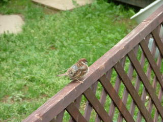 | 今日のスズメ: 少子化が懸念されているスズメですが、 うちのヒナは無事にかえったようです。 右側の、ほっぺの色が薄いほうがヒナ。 |
