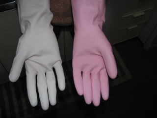 ゴム手袋って、圧倒的に利き手の方が破れますよね。 うちにも左手だけが5本もたまっています。 「左利きの人とシェアできれば・・」と思うのですが、 私には左利きの知り合いはいないし(誰もシェアなんかしないか・・) なんとか使えないかと思案していて、ひらめいたのが、これ! 裏返せばいいんです! すべりの悪いのと汗ばむのがたまに傷ですが、短時間の作業なら 全く問題なし! 使用後は裏返して乾かしておけばOK! ➡後日談 やっぱり使いにくくて、この案はボツ! |