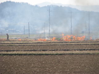 店に行く途中の田んぼの光景。 煙っていて驚きましたが、今日は野焼きの日だったようです。 乾燥しているからか、草はよく燃えていました。 風もなく穏やかでしたから、作業もはかどったことでしょう。 |