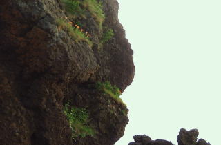 海岸沿いの奇岩には、わずかの土の上に 驚くほどの植物が育っています。 満開のスカシユリも、美しい夕日に見とれて いるようです。 |