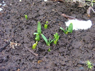 | 今日の ちょっとうれしい: 壁沿いの雪が解けた花壇には、クロッカスが芽を出しました。大きなエゾシカが 道を闊歩しているので、何とかシカの食害から守らなければ! また、凍って枯れていた鉢植えのローズマリーが、復活しました。ローズマリーはこの辺では 越冬が難しいので、益子に持って行って、庭に植えてこようと思っています。 |